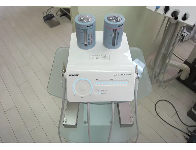 通常のPMTCでは取り除くことの出来ない歯の裏側のすき間や小さな溝に入り込んだマクロのステイン(着色)を強圧の水と空気と超微粒子パウダーを吹き付けて取り除きます。